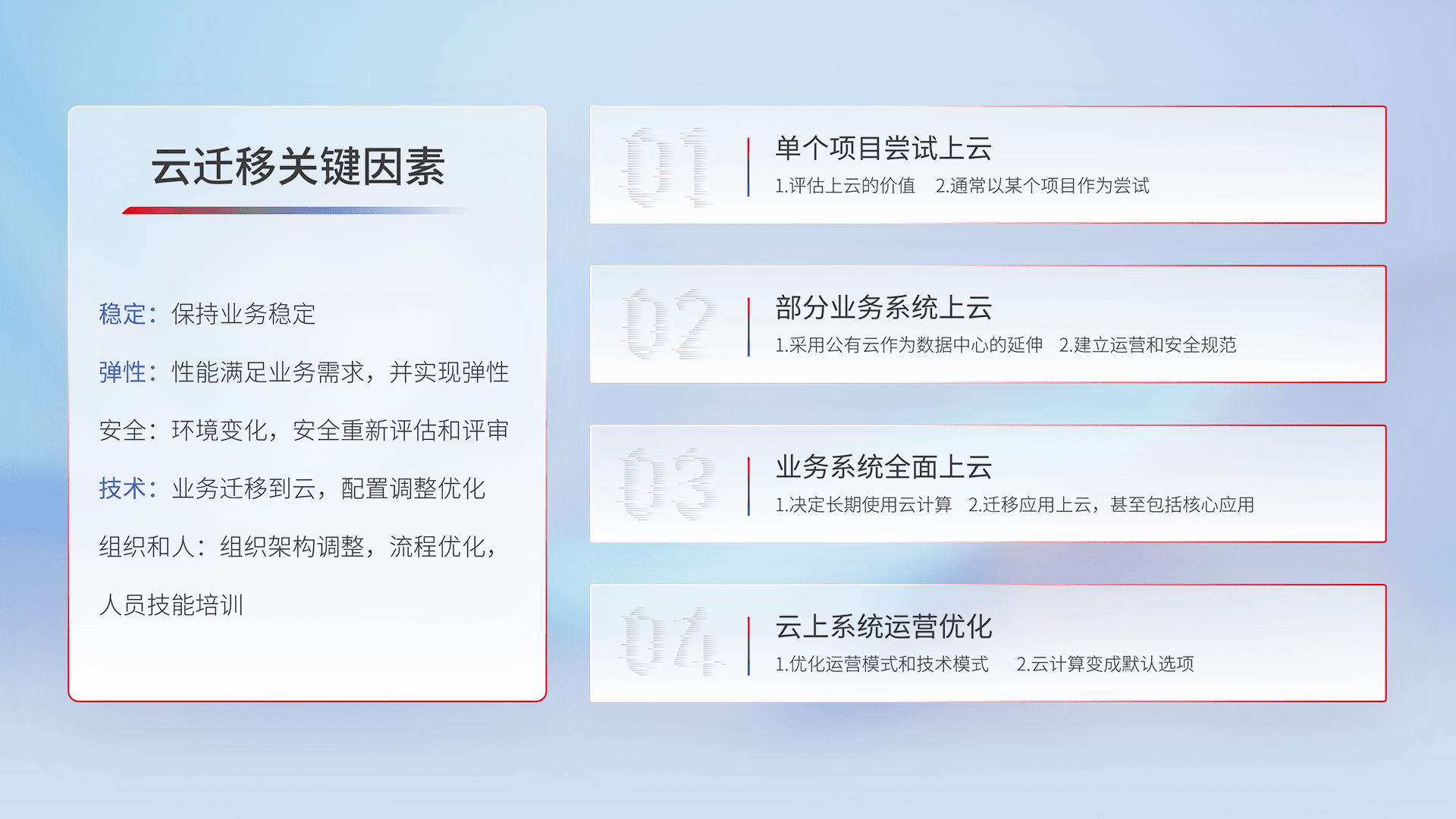 结合实际业务,,,,从规划设计、、、、云平台选型、、、、云原生改造、、、数据迁移、、、集成交付,,,迁移全过程为客户识别最佳上云路径,,做好风险识别管理,,,设计网络架构、、身份权限、、、安全审计合规、、、操作审计、、、日志审计、、、监控告警策略、、多站点容灾设计等,,对云上基础设施进行整体规划,,提升IT治理水平,,,以满足弹性、、、高可用、、、、高性能的需求。。。。