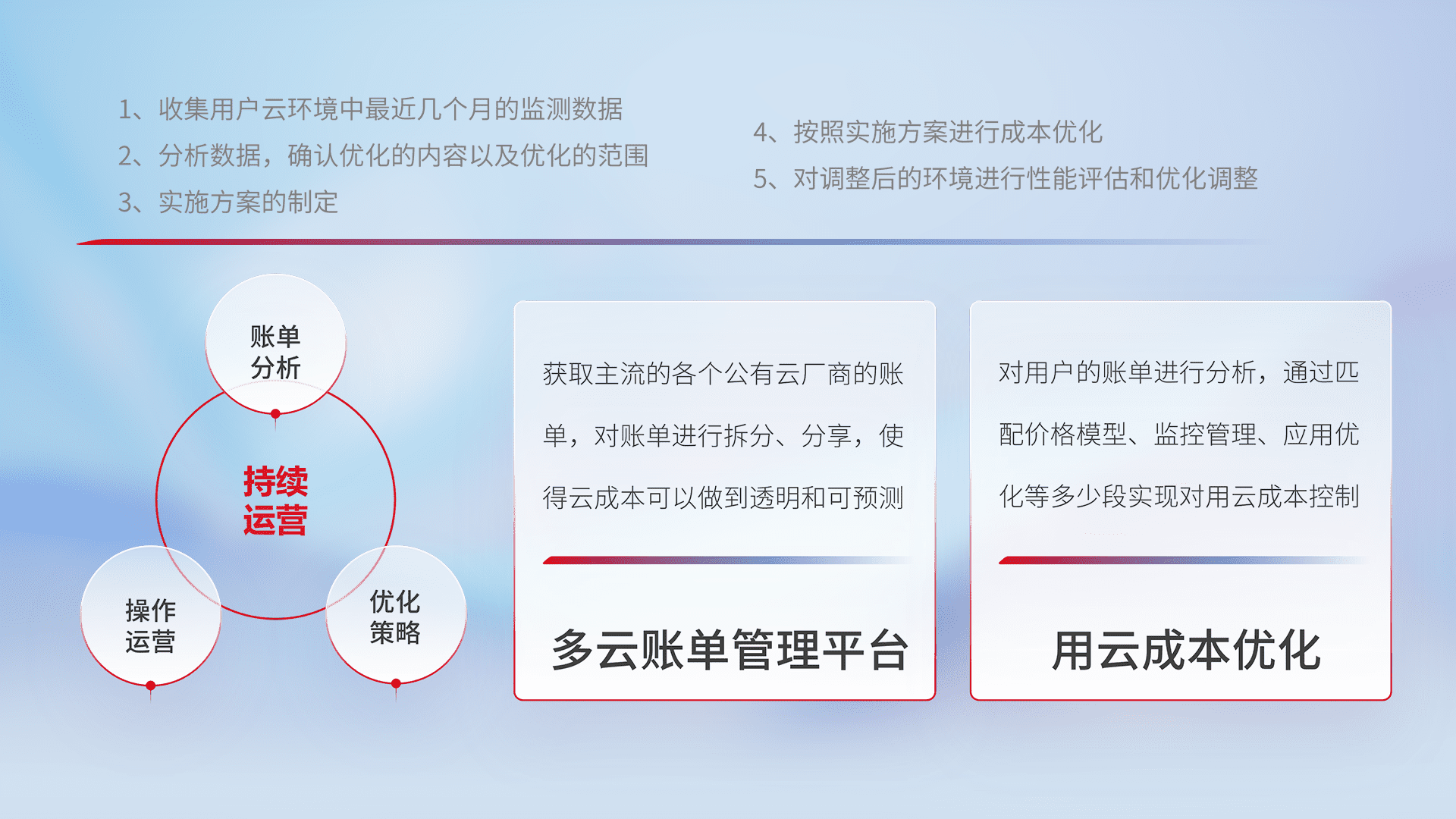 通过多云纳管,,,,以统一的资源数据模型把客户的云资源进行抽象和封装,,进而实现对多云资源的统一操作,,保障云资源管理的可靠性、、、、稳定性与可用性。。。量身定制化运维内容,,配置、、、开发运维、、、、补丁管理、、、备份、、、、监控、、、认证和访问管理、、审计和日常巡检等,,,,保障在用云过程中的可靠度,,稳定度以及高可用率。。